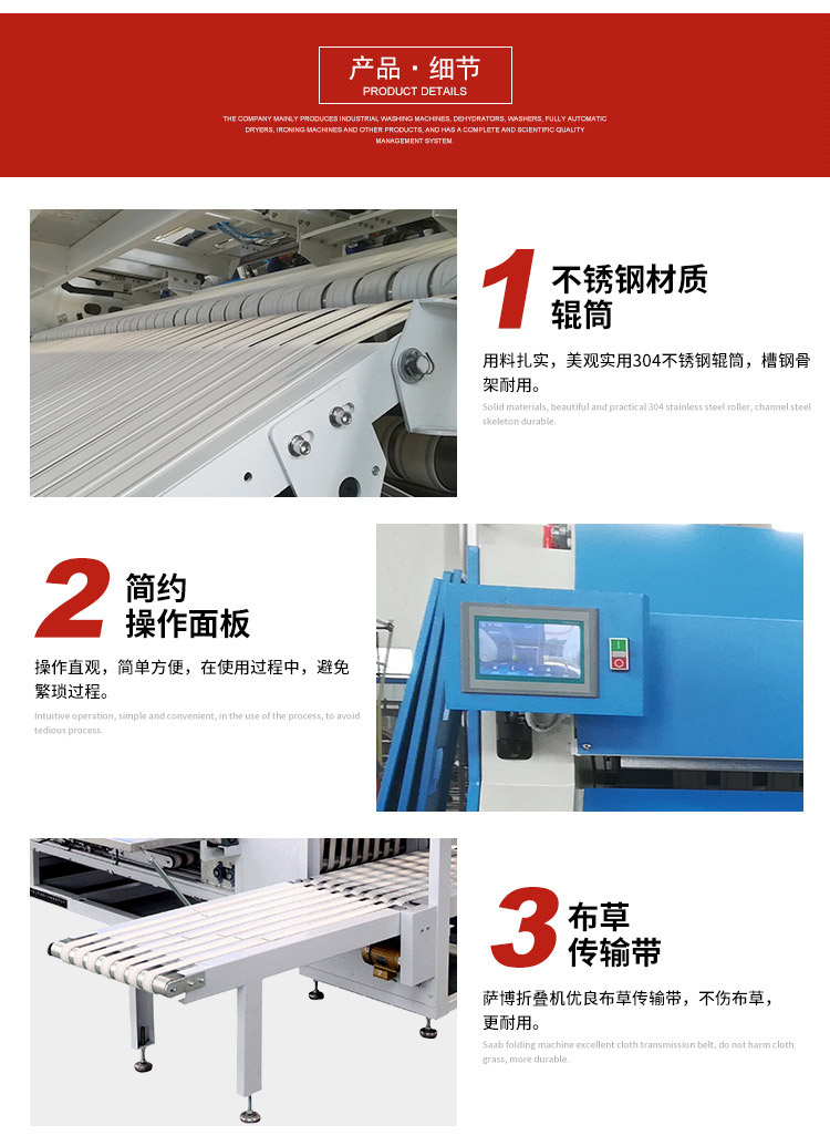 工業(yè)折疊機(jī)采用大屏點(diǎn)陣液晶顯示及智能化控制系統(tǒng)。并且有良好的中英文人機(jī)對(duì)話界面;在電腦控制下完成五次折疊。縱折和橫折次數(shù)可按織物幅度、厚度自由編程;采用高智能化的紅外線檢測(cè)系統(tǒng),取消了傳統(tǒng)的機(jī)械脈沖技術(shù)裝置;具有雙通道折疊功能,可雙倍提高小型布草的熨平折疊能力,降低耗能;運(yùn)轉(zhuǎn)速度調(diào)節(jié)范圍大,能與各種相應(yīng)的熨平機(jī)匹配;具有自診斷功能,完善的安全保護(hù)系統(tǒng),監(jiān)測(cè)點(diǎn)自保養(yǎng)功能;電腦板采用繼電器輸出,無(wú)需中間繼斷器減少了故障點(diǎn),維修檢測(cè)方便;各控制組件均采用直流24v低壓組件,安全可靠,便于直接維修;各控制閥均采用氣動(dòng)控制,動(dòng)作迅速可靠,對(duì)周圍環(huán)境無(wú)污染;本設(shè)備多處裝有安全開(kāi)關(guān),使用安全可靠。